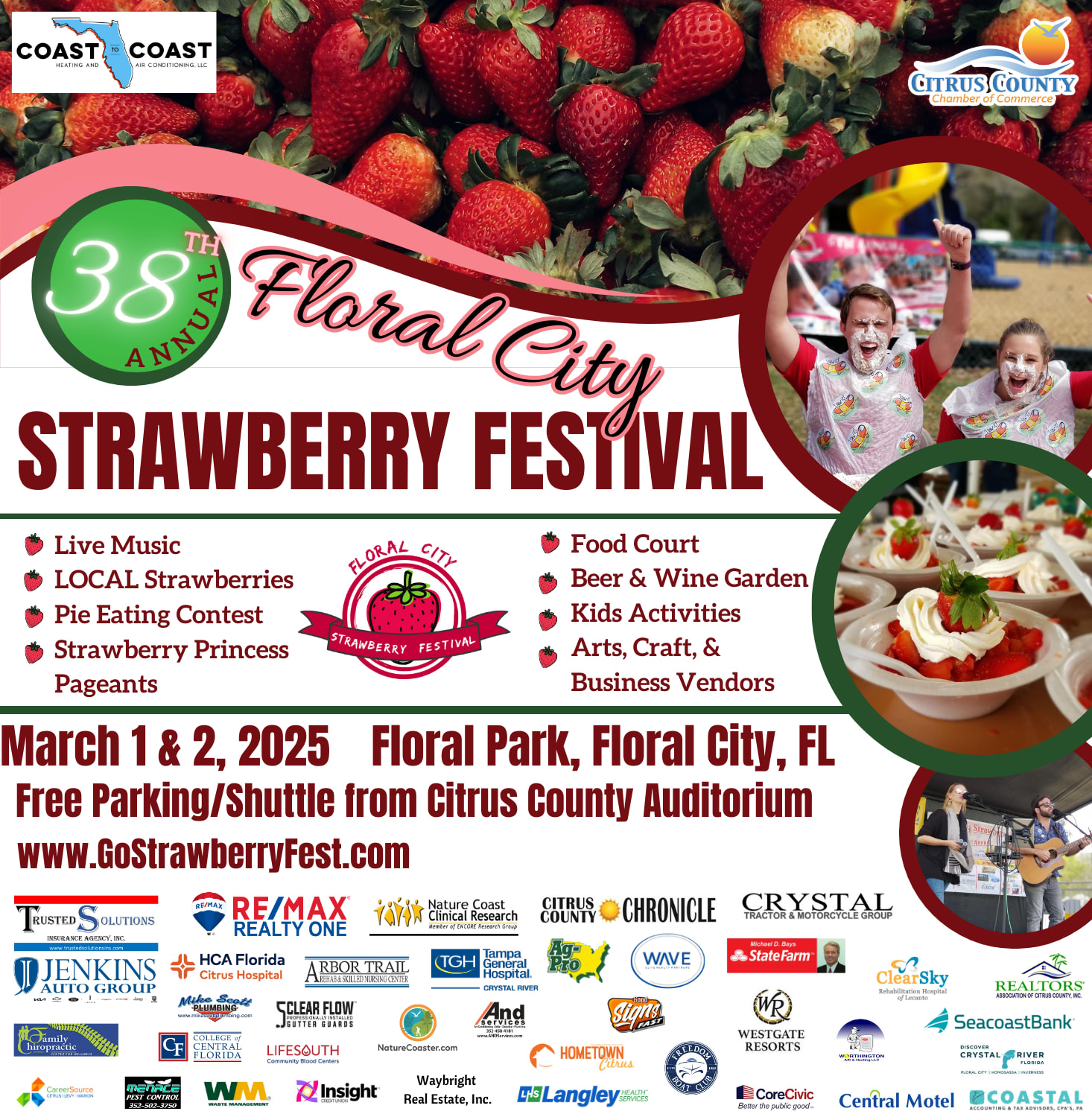 The Floral City Strawberry Festival, a beloved tradition in Citrus County, is back for its 38th year of berry-filled fun and excitement. Presented by Coast to Coast Heating & Air Conditioning and produced by the Citrus County Chamber of Commerce, this year's festival promises a weekend overflowing with strawberries, entertainment, and family-friendly activities. Mark your calendars for March 1st & 2nd, 2025, and join us at Floral Park for a celebration of local agriculture and community spirit.