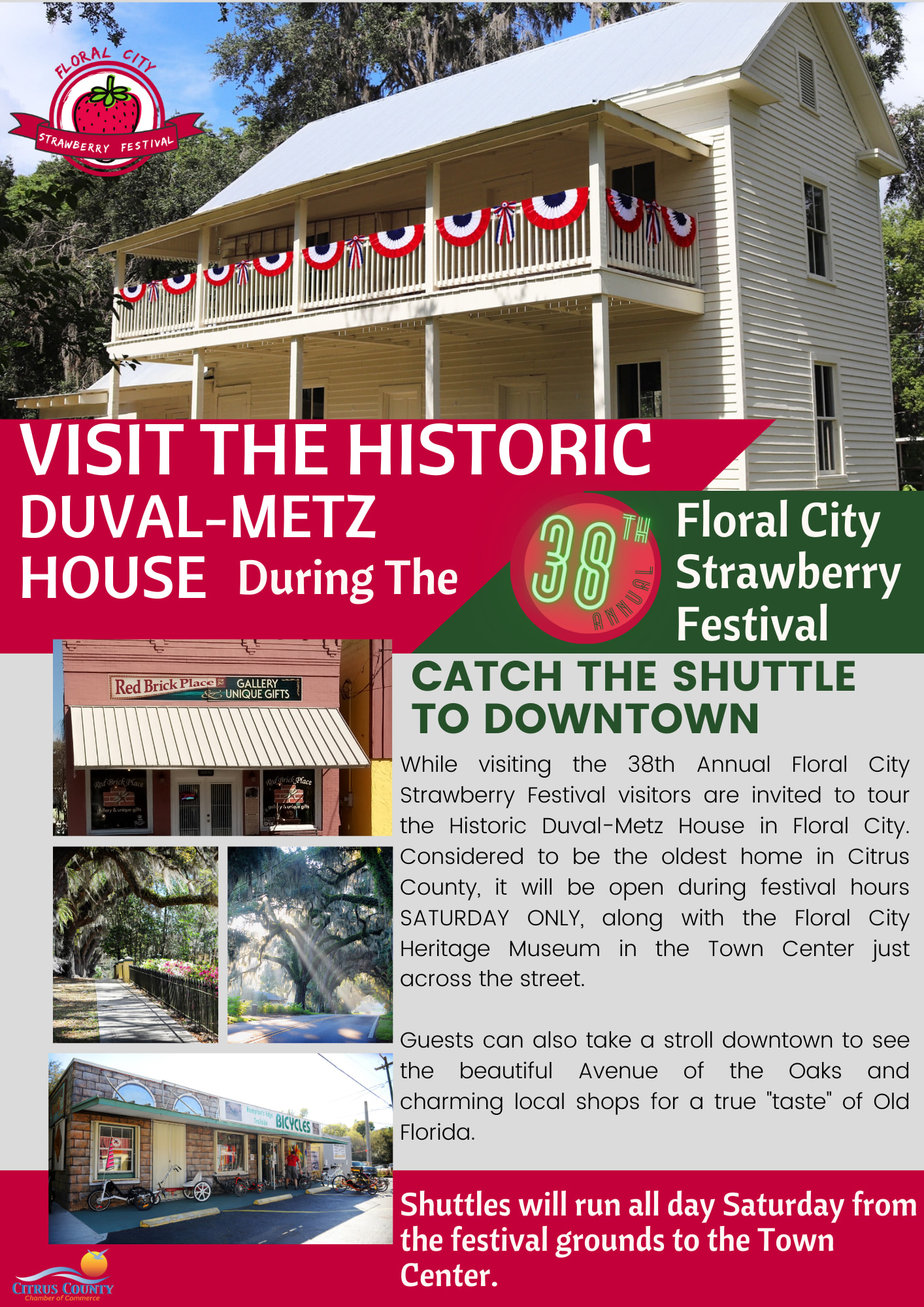 During the festival weekend on Saturday, March 1st, guests are invited to visit the Historic Duval-Metz House between where they will be offering tours. Situated just across the street from the Floral City Heritage Museum in the Town Center, the house offers a unique experience for history enthusiasts and curious visitors alike. Additionally, the Floral City Heritage Hall Museum and Museum "Country" Store will be open free of charge during the festival as well!